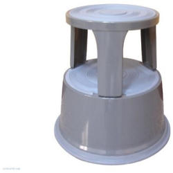 Három kis keréken guruló fellépőzsámoly, amely a fellépő személy súlyától lesüllyed és fixen áll a talajon. Terheletlen állapotban gurítható. Alsó gumiszegély a bútorok védelmében. Magasság, terhelés nélkül: 43 cm. Terhelve: 41,5 cm. Felső átmérő: 29,5 cm. Alsó átmérő: 44,5 cm. Súly: 5 kg. Maximális terhelhetőség: 150 kg. .