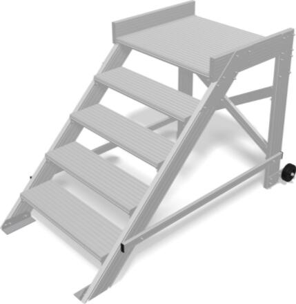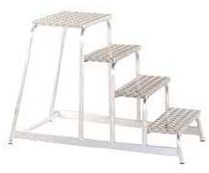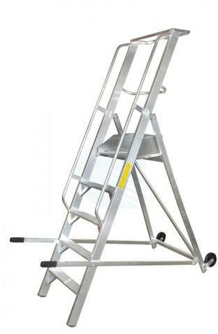 Alumínium munkafelület négy fokkal, alkalmas raktárakba, levéltárakba vagy boltokba. Bordázott csúszásgátló lépcsők és munkafelület. Az egyes fokok között távolság 20 cm. A tartóprofilok végein műanyag talpak találhatók.