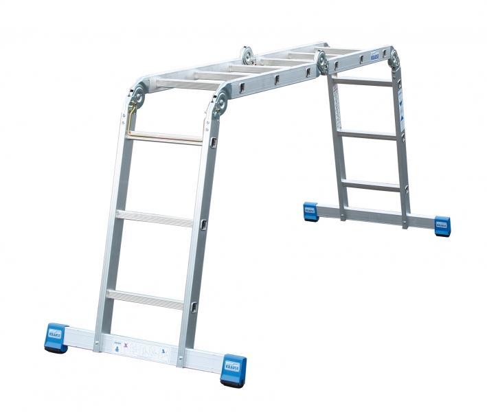 2020.10. 01-vel az EN-131-4 szabványrész változása értelmében, miszerint a munkadobogóként is használatos csuklós létrákhoz dobogót is biztosítani kell. Négyrészes univerzális alumíniumlétra csuklókkal: használható támasztó vagy állólétraként, illetve állványként (csak a 4x3 fokos változat esetén) A létra csuklóit szabadalmazott KRAUSE mozgatóelem köti össze,