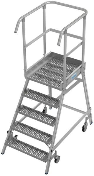 "Helyhez kötött vagy mozgatható dobogó az akadályok áthidalásához vagy munkadobogóként kétoldali hozzáféréssel. Nagyméretű dobogó korláttal a biztonságos és ergonomikus munkavégzéshez a magasban. Választható fokszélesség 600, 800 és 1000 mm. A lépcsők és a dobogó bevonata alapfelszerelésben bordázott alumíniumból (R10). Választható acélrácsos (R12) és perfor