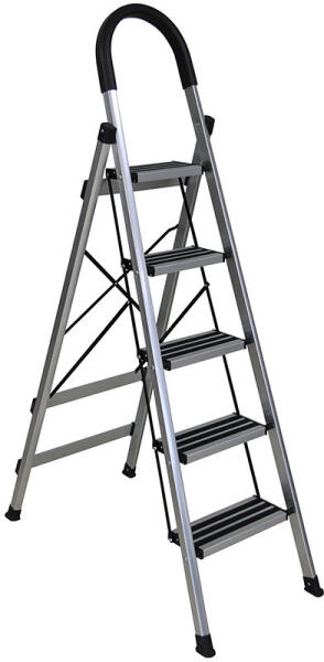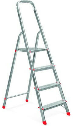 Alumínium háztartási létra 3 +1 fokos Terhelhető max: 120 kg Háztartási használatra, stabil és biztonságos széles lépcsőfokok A létra műanyag csúszásmentes talpakkal rendelkezik Munkamagasság: 280 cm