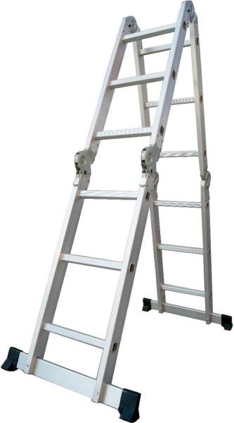 Alumínium létra Kivitel: 4 ágú összecsukható kivitel Méret - nyitott állapotban: 360 x 49 x 18 cm Méret - zárt állapotban: 27,5 x 37 x 98 cm Maximális hosszúság: 99 cm / 176 cm / 361 cm Lépcsőfokok száma: 12 db Lépcsőfokok közötti távolság: 28,0 cm Alumínium vastagság: 1,3 - 1,5 mm Fokok közötti távolság: nem Beépített zár mechanizmusok