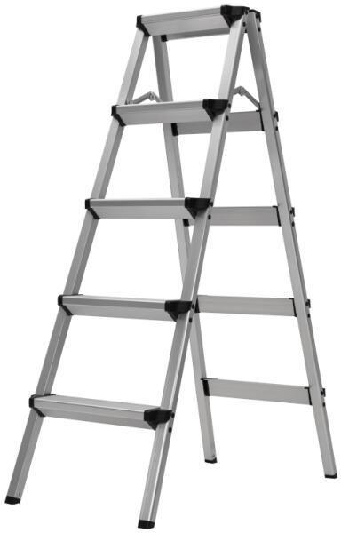 Raktárkészletünkön azonnal elérhető bútorok - 5 lépcsős összecsukható alumínium bíztonsági létra. Extra nagy, csúszásmentes lépcső fokokkal. Kapaszkodóval, munka tálcával, vödörtartóval. Cserélhető talpakkal (parkettára, szőnyegre, padlólapra) Maximális teherbírás 150kg