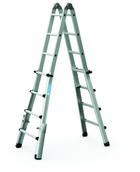 "Többcélú, kihúzható és lépcsőn használható létra kompakt szállítási mérettel, robusztus, hosszú élettartamú kivitelben. A kívánt munkamagasság foktávolságonként állítható. Szállításhoz kompakt és helytakarékosra összetolható. Jól használható, az erős zsanér csavarozott, ezért könnyen cserélhető. Kihajtható kitámasztókkal támasztólétraként való ha