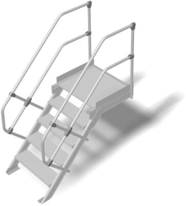 "Helyhez kötött elérése az épületeknek vagy a gépeknek. Különböző dőlésszögek, 45° a kényelmes feljutáshoz, 60° szűk helyekhez. Választható fokszélesség 600, 800 és 1000 mm. A lépcsők és a dobogó bevonata alapfelszerelésben bordázott alumíniumból (R10). Választható acélrácsos (R12) és perforált acéllemezes (R13) kivitelben is a nagyobb csúszásbiztonság ér