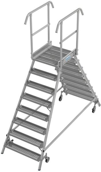 "Helyhez kötött vagy mozgatható dobogó az akadályok áthidalásához vagy munkadobogóként kétoldali hozzáféréssel. Nagyméretű dobogó korláttal a biztonságos és ergonomikus munkavégzéshez a magasban. Választható fokszélesség 600, 800 és 1000 mm. A lépcsők és a dobogó bevonata alapfelszerelésben bordázott alumíniumból (R10). Választható acélrácsos (R12) és perfor