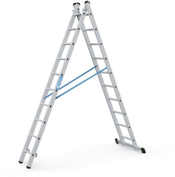 "Két létra egyben: álló- és tolólétra állásbiztonsággal kombinálva. Használható két részes tolólétraként vagy két oldalon járható létraként. A szétcsúszást megakadályozzák az erős perlon gurtnik. A szárak húzott alumínium profilból készülnek a nagyfokú stabilitás érdekében. A cserélhető kétkomponensű műanyag talpkupakok csúszásmentes használatot teszn