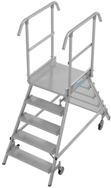 "Helyhez kötött vagy mozgatható dobogó az akadályok áthidalásához vagy munkadobogóként kétoldali hozzáféréssel. Nagyméretű dobogó korláttal a biztonságos és ergonomikus munkavégzéshez a magasban. Választható fokszélesség 600, 800 és 1000 mm. A lépcsők és a dobogó bevonata alapfelszerelésben bordázott alumíniumból (R10). Választható acélrácsos (R12) és perfor