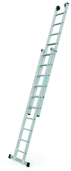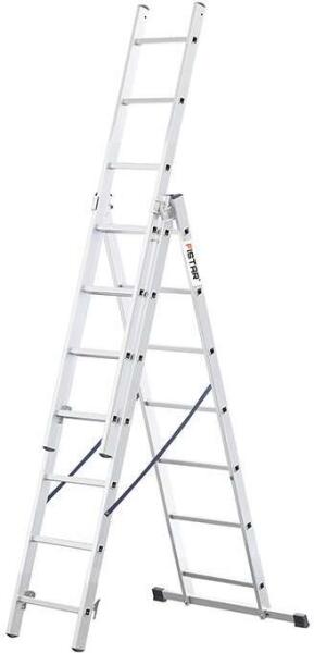 Tripla alumínium létra Erős kialakítású, nagy teherbírású alumíniumból készült, amely sokoldalú használatot és tartósságot biztosít, ideális szakmai felhasználásra. Teljesen kinyújtva vagy összecsukva is használható, attól függően, hogyan szeretné. A létra egy 100 cm hosszú stabilizáló hevederrel van ellátva a fokozott biztonság érdekében. Lépcsők száma: 3x