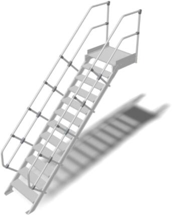 "Helyhez kötött elérése az épületeknek vagy a gépeknek. Különböző dőlésszögek, 45° a kényelmes feljutáshoz, 60° szűk helyekhez. Választható fokszélesség 600, 800 és 1000 mm. A lépcsők és a dobogó bevonata alapfelszerelésben bordázott alumíniumból (R10). Választható acélrácsos (R12) és perforált acéllemezes (R13) kivitelben is a nagyobb csúszásbiztonság ér