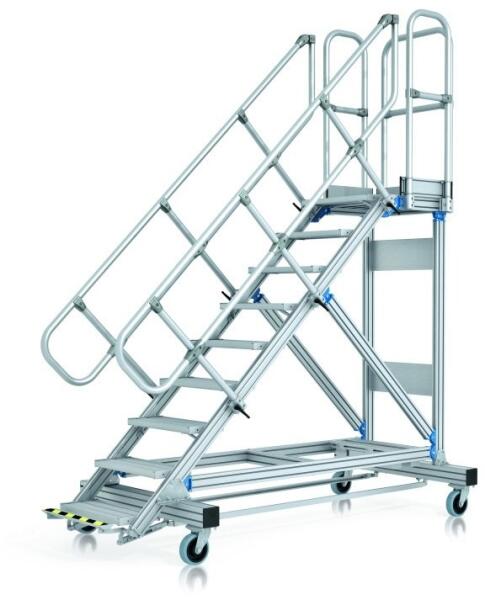 "Mozgatható hozzáférési vagy munkadobogó kényelmes feljutással. Ideális az elhúzódó munkákhoz, szerszámmal is, és akár gyakori helyváltoztatással is. Nagyméretű dobogó korláttal a biztonságos és ergonomikus munkavégzéshez a magasban. Különböző dőlésszögek, 45° a kényelmes feljutáshoz, 60° szűk helyekhez. Választható fokszélesség 600, 800 és 1000 mm. A lép