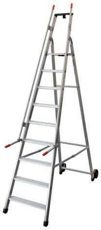 Mobil fellépők kilenc fokkal és műanyag szerszámtartóval. Biztonsági korlát a fokok, fellépők mentén műanyag végződésekkel. A könnyű kezelést a két görgő és a fogantyú bizosítja. A létrafokok szélessége 10 cm, ami lehetővé teszi a kényelmes és a biztonságos fellépést.