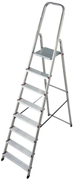 "Körbefutó biztonsági korlátkeretSzegecselt csuklókapcsolatokBordázott acél dobogóStabil, szegecselt kapcsolat a szárak és a fokok közöttCsúszásmentes lábak a biztos állás érdekébenStabil alumínium zártszelvényből készült szárakTerhelhetősége 150 kg"
