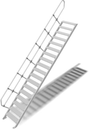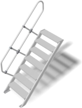 "Könnyűfém lépcsőRobusztus alumíniumlépcső egyedi megoldásokhoz az EN ISO 14122 sszabványnak megfelelően+ Lépcsőfokok szélessége: 600 – 800 – 1000 mm (bordázott alumínium lépcsőfokok)+ Lépcsőfokok mélysége: 225 mm 45° dőlésszögnél és 175 mm 60° dőlésszögnél+ Alumínium rácsos/perforált lemez fokok egyeztetés szerint (240 mm fokmélység 45° dőlésszögné