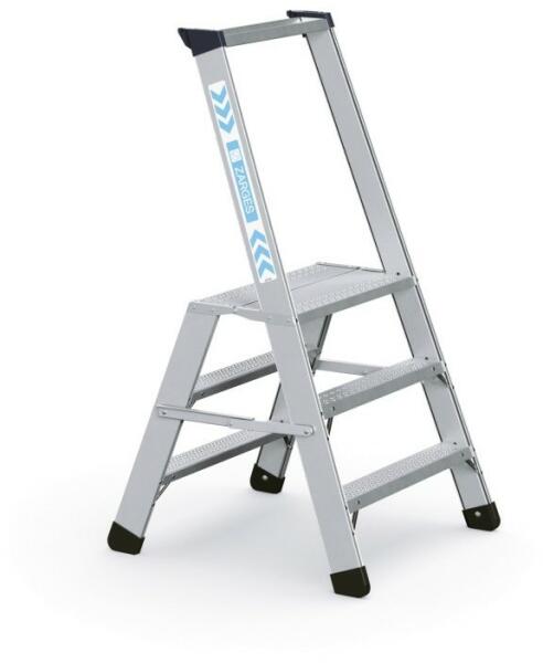 "Helyhez kötött vagy mozgatható dobogó az akadályok áthidalásához vagy munkadobogóként kétoldali hozzáféréssel. Nagyméretű dobogó korláttal a biztonságos és ergonomikus munkavégzéshez a magasban. Választható fokszélesség 600, 800 és 1000 mm. A lépcsők és a dobogó bevonata alapfelszerelésben bordázott alumíniumból (R10). Választható acélrácsos (R12) és perfor