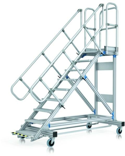 "Mozgatható hozzáférési vagy munkadobogó kényelmes feljutással. Ideális az elhúzódó munkákhoz, szerszámmal is, és akár gyakori helyváltoztatással is. Nagyméretű dobogó korláttal a biztonságos és ergonomikus munkavégzéshez a magasban. Különböző dőlésszögek, 45° a kényelmes feljutáshoz, 60° szűk helyekhez. Választható fokszélesség 600, 800 és 1000 mm. A lép