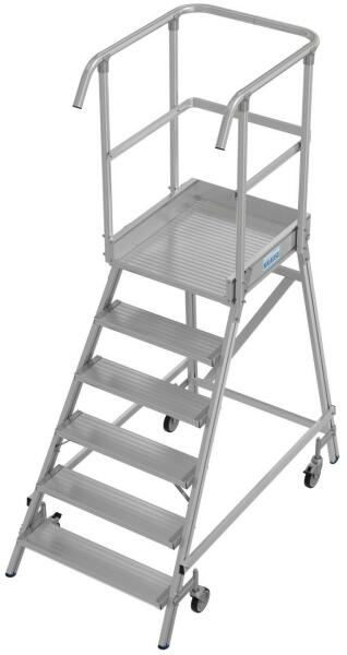"Egy oldalon járható gurítható alumínium dobogó 175 mm mély, csúszásmentes lépcsőfokokkal és nagy állófelülettel, amely körbefutó korláttal van felszerelve a biztonságos és kényelmes munkavégzés érdekébenKis állószélesség, ideális a polcok közelében végzett munkáhozA dobogó mérete 600 x 700 mm, anyaga bordázott alumínium1,0 m magas, 40 mm átmérőjű háromol