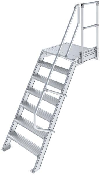 "Helyhez kötött elérése az épületeknek vagy a dobogókkal a gépeknek. Különböző dőlésszögek, 45° a kényelmes feljutáshoz, 60° szűk helyekhez. Választható fokszélesség 600, 800 és 1000 mm. A lépcsők és a dobogó bevonata alapfelszerelésben bordázott alumíniumból (R10). Választható acélrácsos (R12) és perforált acéllemezes (R13) kivitelben is a nagyobb csúszás