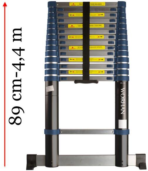 Teleszkópos létra Magasság kihúzva: 4,4 m Szélesség felül: 44 cm Szélesség alul 47 cm Stabilizátor szélessége 67 cm Belső szélesség 32 cm Összecsukva: 89 cm Súlya: csak 13,5 kg! Maximális teherbírás 150 kg Mindig győződjön meg a megfelelő dőlésszögről, és a biztonságos elhelyezésről mielőtt fellép a létrára! További információk:Kihúzható teleszkópos létra