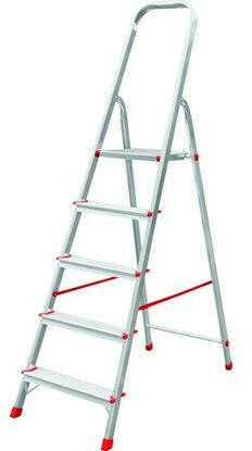 Az alumínium háztartási létra egy oldalon lévő lépcsőfokos Lépcsőfokai: 4+1 Háztartási használatra, stabil és biztonságos széles lépcsőfokok A létra műanyag csúszásmentes talpakkal rendelkezik Munkamagasság: 305 cm Terhelhetőség: 120 kg