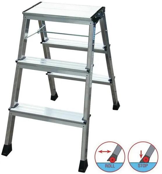 Krause Monto Rolly gurítható lépcsőfokos fellépő 2 x 3 fokos alumínium Két oldalon járható alumínium összecsukható fellépő rug