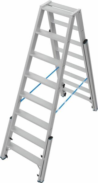 Ez a professzionális használatra kifejlesztett alumínium teleszkópos két oldalon járható létra lépcsőfunkcióval nagy stabilitást biztosít még lépcsőkön, sarkokban, emelvényeken és hasonló magasságkülönbségek esetén történő használat során is. A négy fokozatmentesen állítható szárhosszabbító stabil vezetőkkel biztosítja a lépcsőkön és hasonló szintkülön