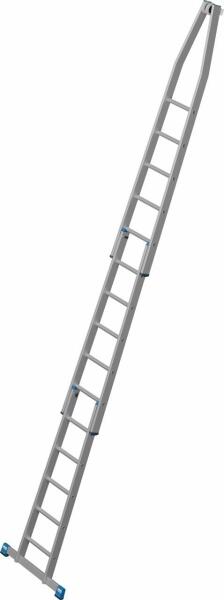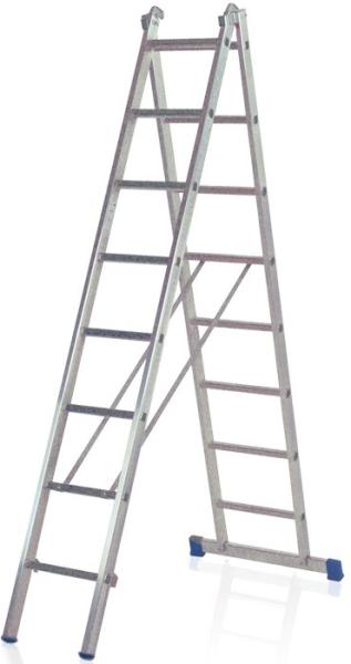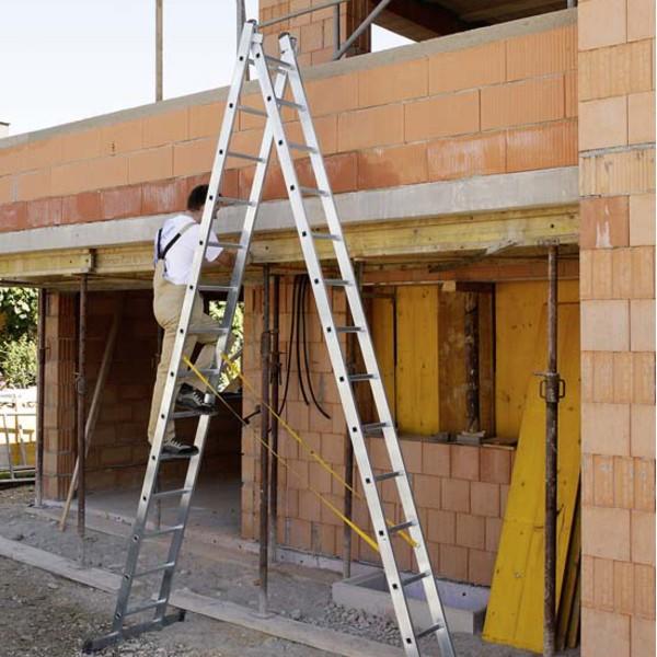 Könnyen tárolható alumínium létraszett. A préselt alumínium profilból készült szárak további sarokmerevítéssel nagy stabilitást és hosszú élettartamot biztosítanak. Nagy szilárdságú peremezett kapcsolat a létrafokok és a szár között. A létra alsó tagja széles kiegészítő kitámasztóval és csúszásmentes lábdugókkal van ellátva (SafetyCap). A létra felső tagj