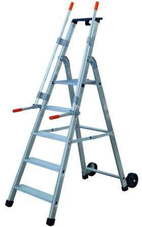 Mobil fellépők öt fokkal és műanyag szerszámtartóval. Biztonsági korlát a fokok, fellépők mentén műanyag végződésekkel. A könnyű kezelést a két görgő és a fogantyú bizosítja. A létrafokok szélessége 10 cm, ami lehetővé teszi a kényelmes és a biztonságos fellépést.