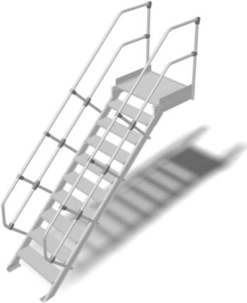 "Könnyűfém lépcső dobogóvalRobusztus alumíniumlépcső ajtók vagy közbenső szintek biztonságos megközelítéséhez, az EN ISO 14122 szabványnak megfelelően. + Dobogó standard mélysége: 700 mm+ Lépcsőfokok szélessége: 600 – 800 – 1000 mm (bordázott alumínium fokok)+ Lépcsőfokok mélysége: 225 mm 45° dőlésszögnél és 175 mm 60° dőlésszögnél+ Alumínium rácsos