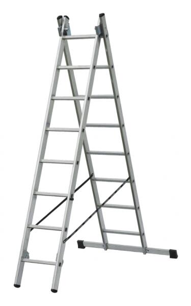 Könnyen tárolható alumínium létraszett. A lépcsőfokok lehetővé teszik a TRBS 2121-2 szabványnak megfelelő munkahelyként való alkalmazást. A préselt alumínium profilból készült szárak további sarokmerevítéssel nagy stabilitást és hosszú élettartamot biztosítanak. Nagy szilárdságú peremezett kapcsolat a létrafokok és a szár között. A létra alsó tagja széles kie