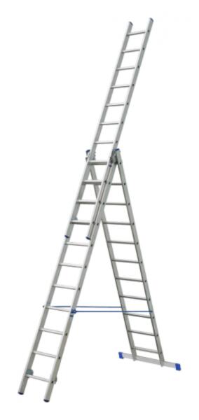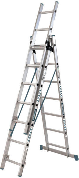 Tripla alumínium létra Erős kialakítású, nagy teherbírású alumíniumból készült, amely sokoldalú használatot és tartósságot biztosít, ideális szakmai felhasználásra. Teljesen kinyújtva vagy összecsukva is használható, attól függően, hogyan szeretné. A létra egy 100 cm hosszú stabilizáló hevederrel van ellátva a fokozott biztonság érdekében. Lépcsők száma: 3x