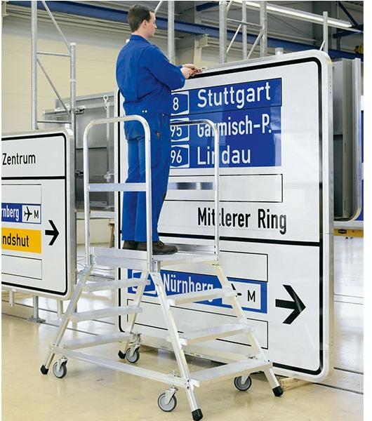 "Mozgatható hozzáférési vagy munkadobogó kényelmes feljutással. Ideális az elhúzódó munkákhoz, szerszámmal is, és akár gyakori helyváltoztatással is. Nagyméretű dobogó korláttal a biztonságos és ergonomikus munkavégzéshez a magasban. Különböző dőlésszögek, 45° a kényelmes feljutáshoz, 60° szűk helyekhez. Választható fokszélesség 600, 800 és 1000 mm. A lép
