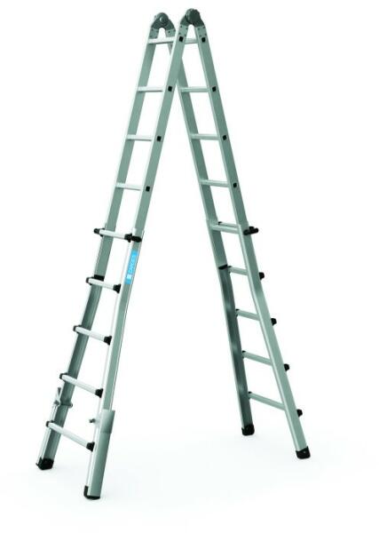 "Többcélú, kihúzható és lépcsőn használható létra kompakt szállítási mérettel, robusztus, hosszú élettartamú kivitelben. A kívánt munkamagasság foktávolságonként állítható. Szállításhoz kompakt és helytakarékosra összetolható. Jól használható, az erős zsanér csavarozott, ezért könnyen cserélhető. Kihajtható kitámasztókkal támasztólétraként való ha