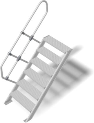 "Helyhez kötött vagy mozgatható dobogó az akadályok áthidalásához vagy munkadobogóként kétoldali hozzáféréssel. Nagyméretű dobogó korláttal a biztonságos és ergonomikus munkavégzéshez a magasban. Választható fokszélesség 600, 800 és 1000 mm. A lépcsők és a dobogó bevonata alapfelszerelésben bordázott alumíniumból (R10). Választható acélrácsos (R12) és perfor