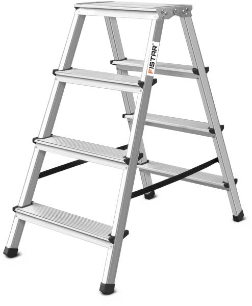 Alumínium kétoldalas fellépő FISTAR, 4x2 fokos állólétra, munkamagasság 2,82 m A kiváló minőségű szerkezet a csúszásmentes lépcsőfokokkal és műanyag élvédőkkel kivételes kényelmet és biztonságot ad munkavégzés közben. Az egyszerű össze- és szétszerelő szerkezet rendkívül könnyű mozgatást és tárolást tesz lehetővé és biztosítja a fellépő jó szállít