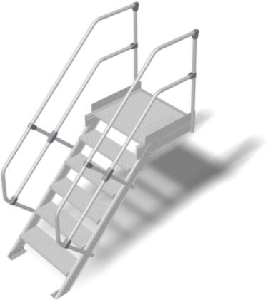 "Helyhez kötött elérése az épületeknek vagy a gépeknek. Különböző dőlésszögek, 45° a kényelmes feljutáshoz, 60° szűk helyekhez. Választható fokszélesség 600, 800 és 1000 mm. A lépcsők és a dobogó bevonata alapfelszerelésben bordázott alumíniumból (R10). Választható acélrácsos (R12) és perforált acéllemezes (R13) kivitelben is a nagyobb csúszásbiztonság ér
