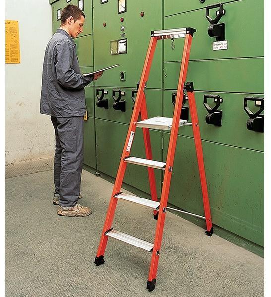ZARGES EFAmix S egy oldalon járható állólétra, 3 fok A speciális létra a villamos környezetben végzendő összes munkához. 80 mm mély könnyűfém lépcsők csúszásmentes bordázattal. Elektromos berendezéseken végzett munkákhoz ajánlott, mivel az üvegszál erősítésű műanyag szárprofilok kiválóan szigetelnek. Biztonsági dobogó (250 x 250 mm). A szerszámok és alkatr