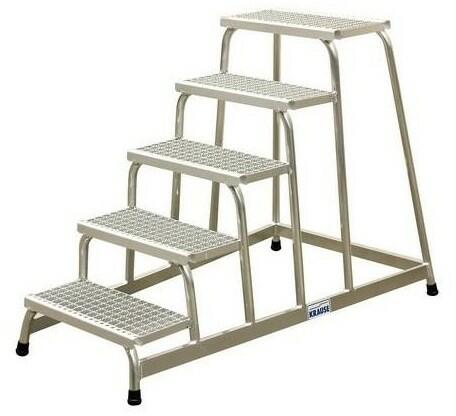 "Helyhez kötött vagy mozgatható dobogó az akadályok áthidalásához vagy munkadobogóként kétoldali hozzáféréssel. Nagyméretű dobogó korláttal a biztonságos és ergonomikus munkavégzéshez a magasban. Választható fokszélesség 600, 800 és 1000 mm. A lépcsők és a dobogó bevonata alapfelszerelésben bordázott alumíniumból (R10). Választható acélrácsos (R12) és perfor