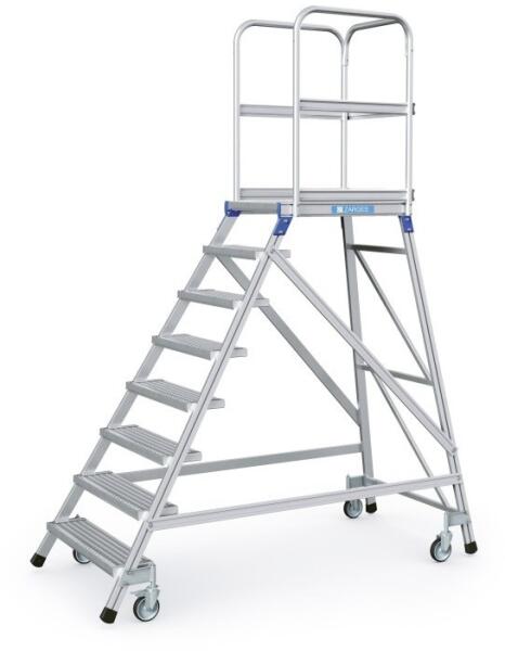 "Mozgatható hozzáférési vagy munkadobogó kényelmes feljutással. Ideális az elhúzódó munkákhoz, szerszámmal is, és akár gyakori helyváltoztatással is. Nagyméretű dobogó korláttal a biztonságos és ergonomikus munkavégzéshez a magasban. Különböző dőlésszögek, 45° a kényelmes feljutáshoz, 60° szűk helyekhez. Választható fokszélesség 600, 800 és 1000 mm. A lép