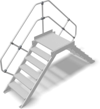 "Helyhez kötött vagy mozgatható dobogó az akadályok áthidalásához vagy munkadobogóként kétoldali hozzáféréssel. Nagyméretű dobogó korláttal a biztonságos és ergonomikus munkavégzéshez a magasban. Választható fokszélesség 600, 800 és 1000 mm. A lépcsők és a dobogó bevonata alapfelszerelésben bordázott alumíniumból (R10). Választható acélrácsos (R12) és perfor