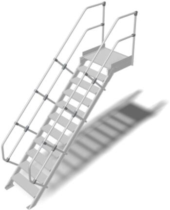 "Könnyűfém lépcsőRobusztus alumíniumlépcső egyedi megoldásokhoz az EN ISO 14122 sszabványnak megfelelően+ Lépcsőfokok szélessége: 600 – 800 – 1000 mm (bordázott alumínium lépcsőfokok)+ Lépcsőfokok mélysége: 225 mm 45° dőlésszögnél és 175 mm 60° dőlésszögnél+ Alumínium rácsos/perforált lemez fokok egyeztetés szerint (240 mm fokmélység 45° dőlésszögné