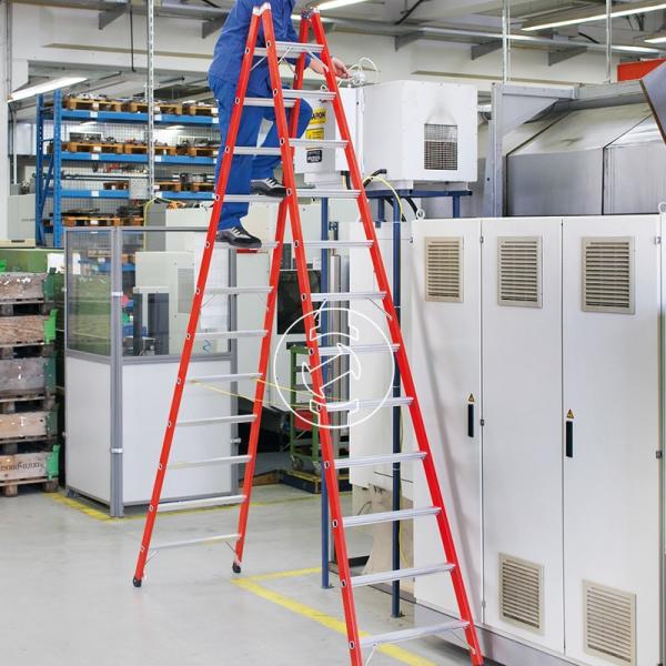 Zarges - EFAmix B Két oldalon járható lépcsős üvegszál-alumínium szerkezetű állólétra 2x10 fokos Üvegszál erősítésű műanyag (GFK) kevert szerkezetű létrafokos állólétraAz optimális megoldás a villamos és vegyi környezetben, különösen alacsony súllyal. + Stabil állás 60 mm mély, csúszásbiztos széles, könnyűfém létrafokok + Nagyfokú védelem az elektromos b