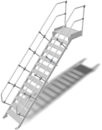 "Könnyűfém lépcsőRobusztus alumíniumlépcső egyedi megoldásokhoz az EN ISO 14122 sszabványnak megfelelően+ Lépcsőfokok szélessége: 600 – 800 – 1000 mm (bordázott alumínium lépcsőfokok)+ Lépcsőfokok mélysége: 225 mm 45° dőlésszögnél és 175 mm 60° dőlésszögnél+ Alumínium rácsos/perforált lemez fokok egyeztetés szerint (240 mm fokmélység 45° dőlésszögné