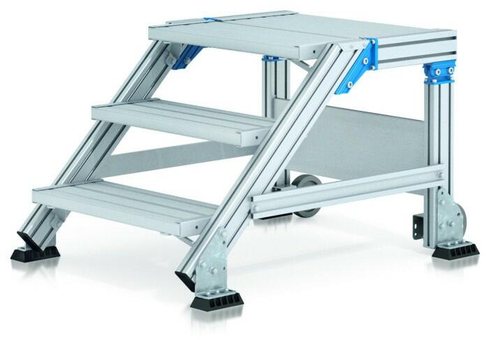 "Egyedi dobogóhosszak. Futómű opcionálisan elektromosságot levezető kivitelben. Konfigurálható 1500 mm-es függőleges magasságig (1000 mm fölött keresztgerendával a nagyobb állásbiztonsághoz). Szerelőelemek: Választható kerekek nélkül vagy helyhez kötött munkadobogó padlókonzollal. A korlát a dobogón egyénileg konfigurálható, opcionálisan lengőajtóval vagy ejtősor