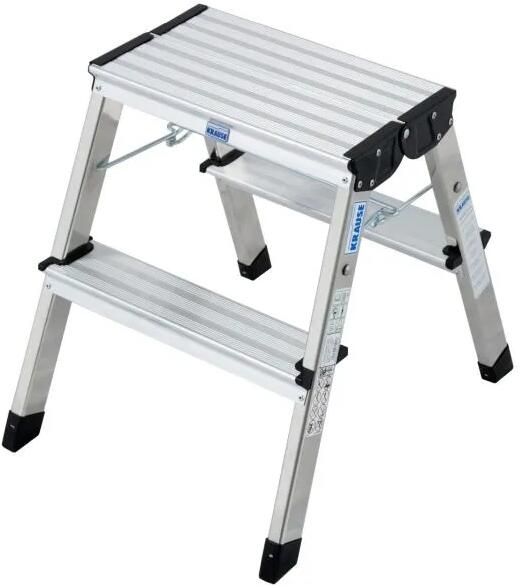 Krause Treppy Monto összecsukható lépcsős fellépő 2 x 2 fokos - nagy, 350 x 200 mm-es felső fellépő stabil helyzetet biztosít - 80 mm széles, csúszásgátló fokok a biztonságos fellépésért és a kényelmes állásért - fok és szárkapcsolat erősített acél s