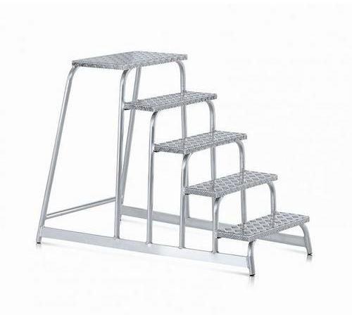Alumínium munkafelület öt fokkal, alkalmas raktárakba, levéltárakba vagy boltokba. Bordázott csúszásgátló lépcsők és munkafelület. Az egyes fokok között távolság 20 cm. A tartóprofilok végein műanyag talpak találhatók.