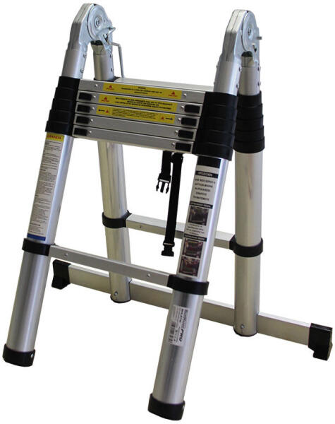 Teleszkópos létra Magasság egyágú létraként: 500 cm Magasság kétágú létraként: 243 cm Magassága összecsukva: 91 cm Létrafokok száma: 2x8 Szélesség felül: 49 cm Stabilizáló talp szélessége: 68 cm Belső szélesség: 31,8 cm Súlya: csak 18 kg Maximális teherbírás 150 kg Mindig győződjön meg a megfelelő dőlésszögről, és a biztonságos elhelyezésről mielőtt fell