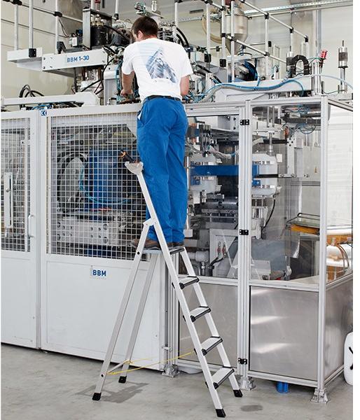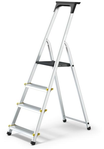 A sípcsont kímélése: magas munkakényelem a párnázott fokok révén. 80 mm mély lépcsők párnázott elülső élekkel. Létraszárak kopásálló eloxált alumíniumból. Az állólap húzott alumínium profilból (300 mm× 250 mm) készül a biztonságos és kényelmes álláshoz a hosszan tartó munkáknál is. Praktikus alumínium eszköztartó a szerszámok és kis alkatrészek szám