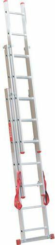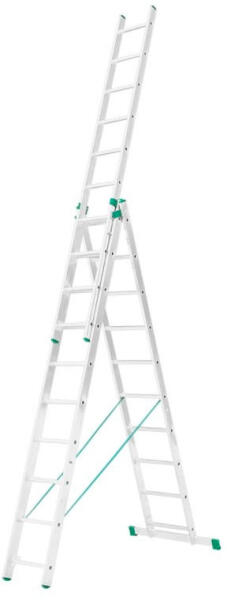 Tripla alumínium létra Erős kialakítású, nagy teherbírású alumíniumból készült, amely sokoldalú használatot és tartósságot biztosít, ideális szakmai felhasználásra. Teljesen kinyújtva vagy összecsukva is használható, attól függően, hogyan szeretné. A létra egy 110 cm hosszú stabilizáló hevederrel van ellátva a fokozott biztonság érdekében. Teljes hosszúság: