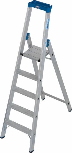 Robusztus alumínium állólétra multifunkciós tálcával és vödörtartóval professzionális használatra, különösen csúszós, olajos munkafelületekhez. 80 mm mély, R13 lépcsőfokok lyukacsos felülettel a biztonságos állás érdekében. Stabil alumínium biztonsági dobogó sajtolt profilból, csúszásmentes R13 bordázással és kétoldali emelőkarral. A profil nem tömődik el s